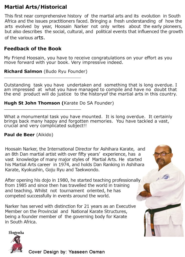 Hoosain Narker, the author of “The History of Martial Arts in South Africa,” has a rich background in martial arts. Born in Cape Town in 1963, he started training in Shotokan Karate at age 10 and the following year joined Shukokai Karate under Eric Smith and Jonathan Tommy. He later trained in Kyokushin Karate under Shihan Neville Paulsen and eventually joined the Japanese Ashihara Karate Organisation, becoming the International Director for a separate organisation – Ashihara Karate International.